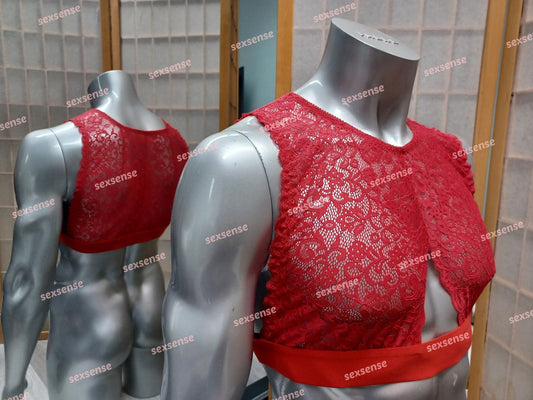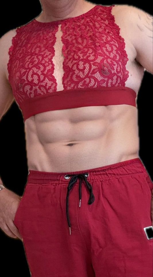 Herren Bustier BH Designerwäsche Sissy elastische Spitze himbeerrot Top Shirt