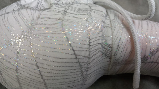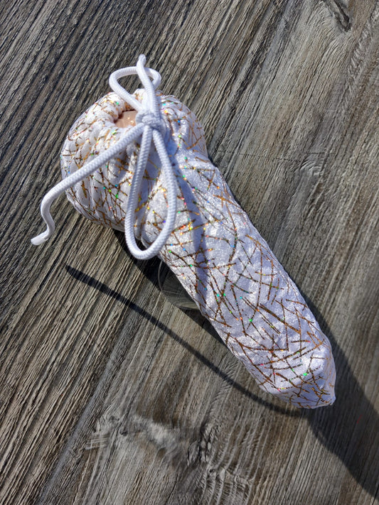 Penissocke Lümmeltüte Juwelensäckchen weißer Lycra Samt mit Hologramm Glitter Gold Glockenhalter Willyärmer