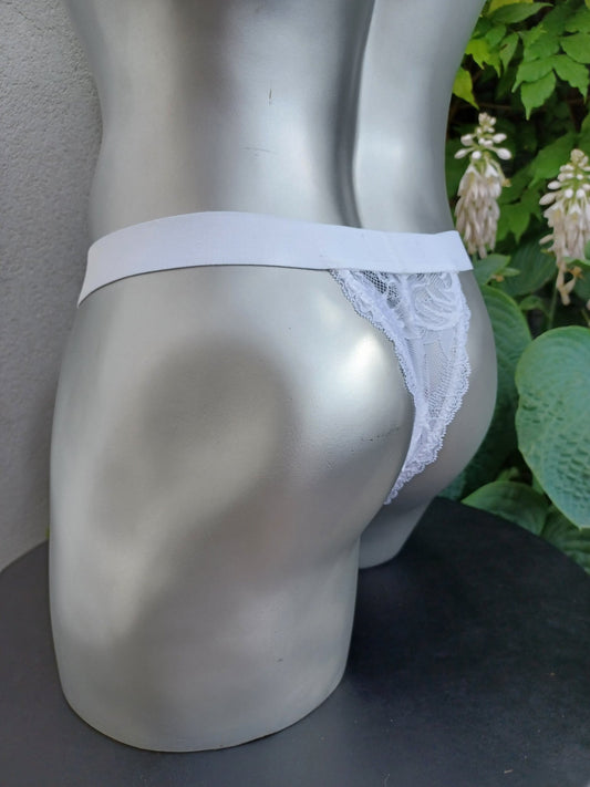 Herren Corsagen-String weiß französische Spitze sexy Dessous en Vogue Front geschnürt
