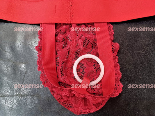 "Korsett" Spitzen-Corsagen-Thong rot Sissy Suspensorium geschnürt Play-Toy und Cockring