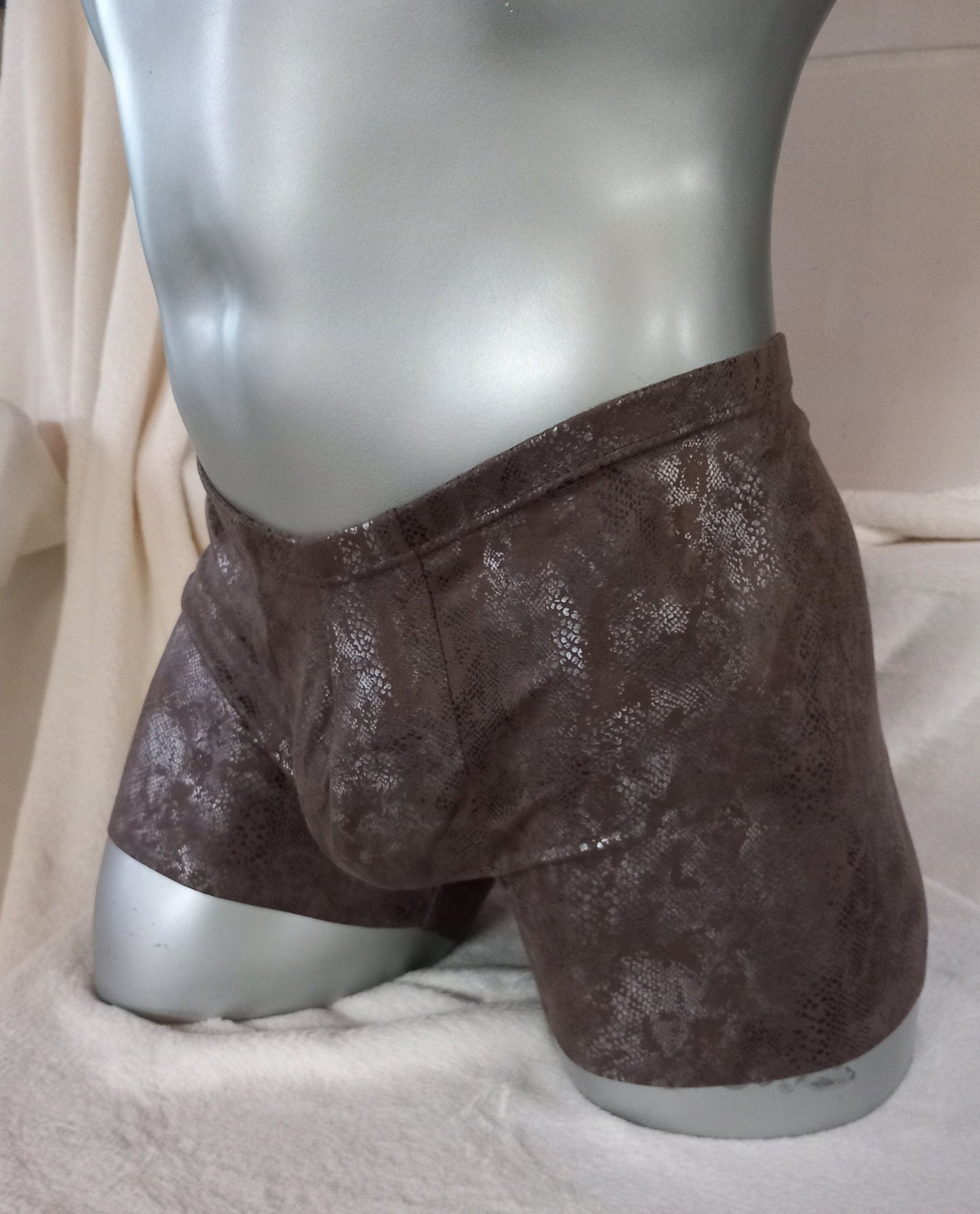 Diese körpernah geschnittene Herren-Boxershorts vereint exotische Schlangenoptik mit samtigem Wildleder-Feeling. Der dunkelbraune Snakeprint auf elastischem Wildlederimitat sorgt für einen luxuriösen, animalischen Look – sinnlich und stilvoll zugleich. Ideal als extravagante Unterwäsche oder auffällige Badehose.