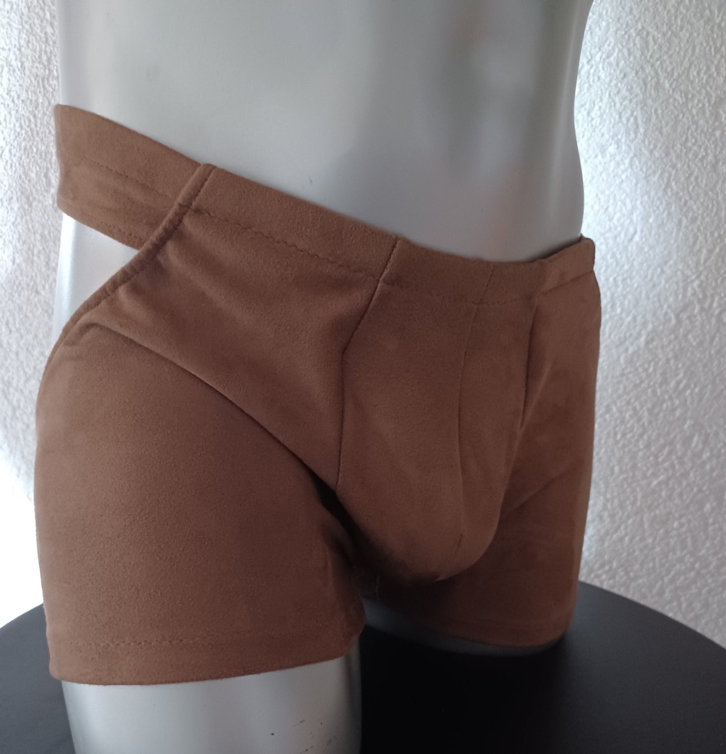 Exklusive Herren-Boxershorts aus hochwertigem braunem Wildleder-Imitat. Das Po-offene (open butt) Design verleiht diesem Modell seinen unverwechselbaren Fetisch-Charakter und sorgt für ein provokantes, selbstbewusstes Auftreten. Die samtig-weiche Oberfläche schmiegt sich angenehm an die Haut und bietet zugleich eine maskuline, kernige Optik. Perfekt geeignet für Gay- und Fetisch-Szene, aber auch für Männer, die gerne mit besonderen Styles experimentieren.