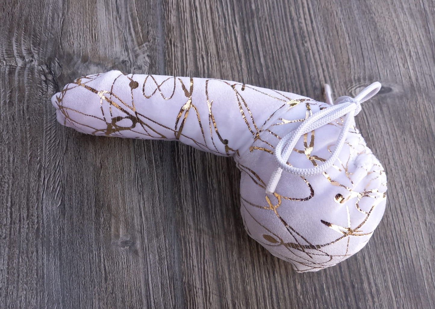 Penissocke Lümmeltüte Juwelensäckchen weißer Lycra Samt mit Gold Sackhalter Willy-Pyjama